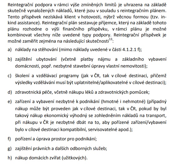 В рамках проекта граждане третьих стран (не входящих в ЕС), пообещавшие покинуть Чехию и не возвращаться не только в республику, но и в Евросоюз, смогут получить до 4 тыс. евро (около 100 тыс. крон). Деньги будут выплачиваться на конкретные цели – покупку билетов, аренду жилья на новом месте, учебу, медицинскую помощь, начало предпринимательской деятельности и др. Мигрантам также окажут полную информационную поддержку, помогут составить план отъезда и уладить все формальности с чешскими ведомствами.