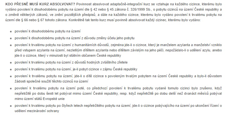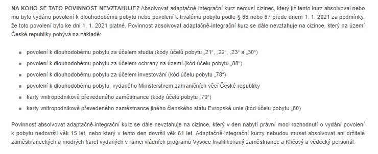 Курс не обязаны проходить мигранты, получившие разрешение на долговременное или постоянное пребывание до 1 января 2021 года. Обязанность далее не распространяется на иностранцев, пребывающих на территории Чешской Республики на основании: