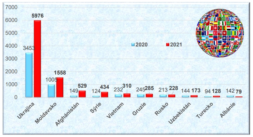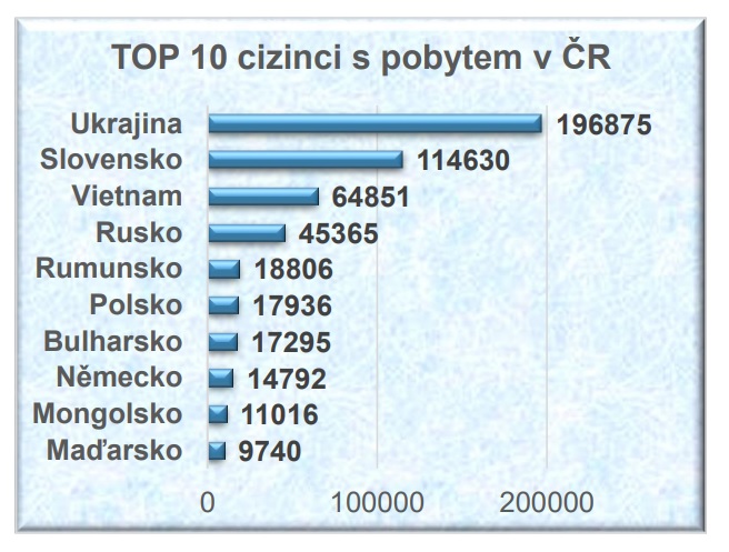 К концу 2021 года на законных основаниях в республике долговременно или постоянно проживали 660849 иностранцев. Самыми многочисленными среди них были украинцы, словаки и вьетнамцы: