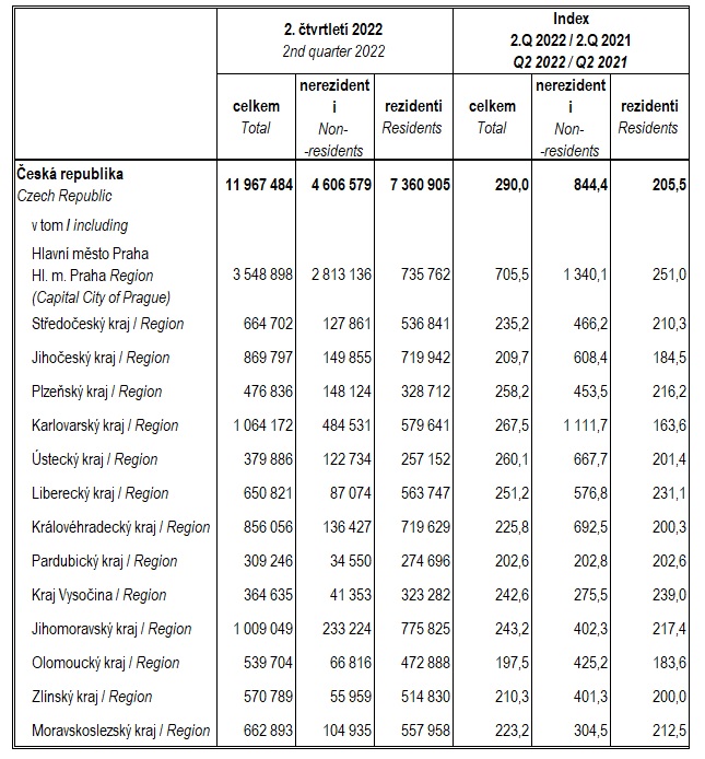 Самым популярным направлениям у чешских и зарубежных путешественников была Прага – ее во втором квартале посетили 3,5 млн туристов. Это в семь раз больше, чем за аналогичный период прошлого года, и 75% от доковидной посещаемости. Однако и здесь нужно принимать во внимание описанный выше нюанс с подсчетом украинских беженцев, для которых столица была главной точкой въезда в Чехию.
