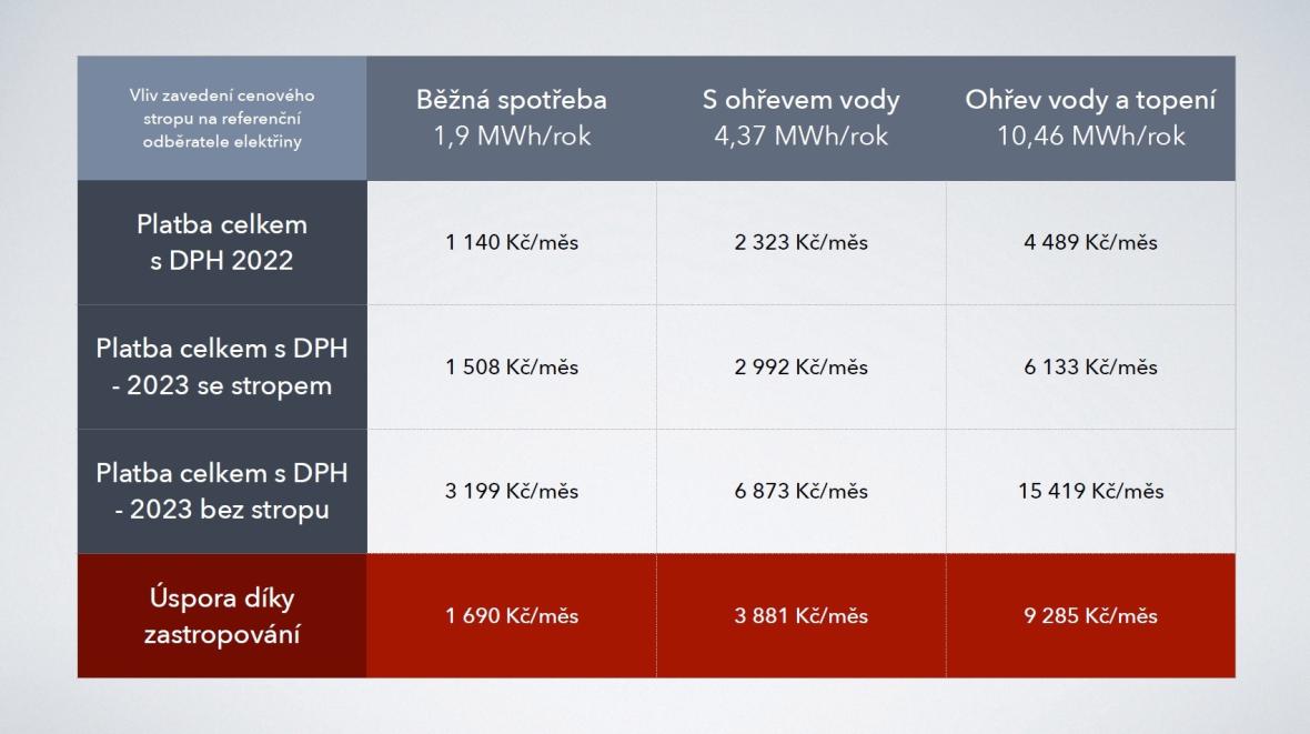 Помимо силовой составляющей цена на электроэнергию включает вторую часть – так называемый регулируемый компонент (regulovaná složka). Вместе с ним и различными дистрибьютерскими сборами итоговая цена электроэнергии для малых потребителей составит от 7 до 9 крон максимум за каждый кВт⋅ч. Без введения «потолка» она равнялась бы на данный момент 12 крон/кВт⋅ч и в будущем могла бы вырасти еще, в зависимости от ситуации на европейском рынке.