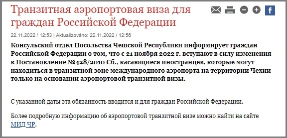 С 21 ноября российские путешественники для нахождения в транзитной зоне любого из международных аэропортов Чехии обязаны заранее получить специальную аэропортовую транзитную визу (letištní průjezdní vízum). Об этом во вторник сообщило Министерство иностранных дел ЧР.