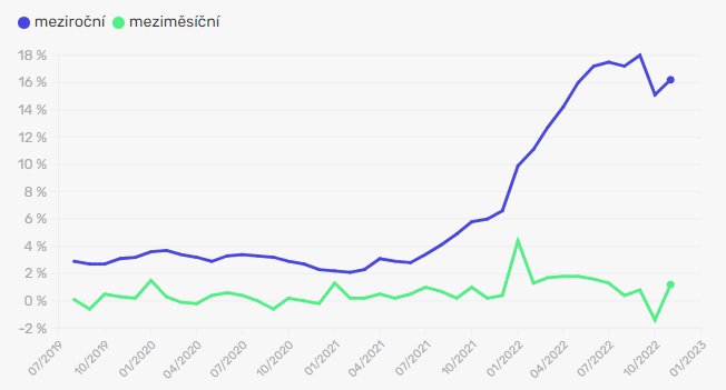 Инфляция в Чехии после октябрьского замедления вновь перешла к росту. В ноябре она выросла на 1,2% и составила 16,2%. Такие данные в понедельник опубликовало Чешское статистическое управление.