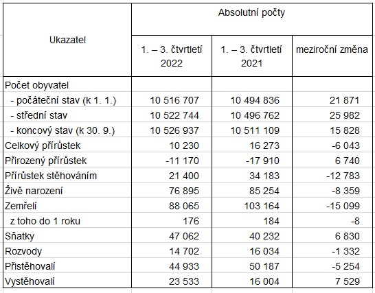 За первые три квартала 2022 года численность населения Чехии увеличилась на 10230 человек до 10,527 млн жителей. Прирост обеспечила исключительно миграция, поскольку число умерших превысило число новорожденных. Такие данные в понедельник, 12 декабря, обнародовало Чешское статистическое управление (ČSÚ).