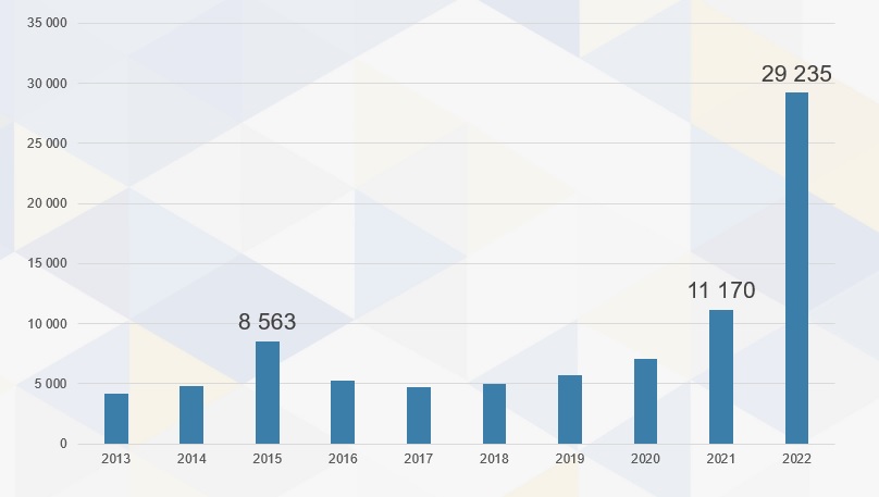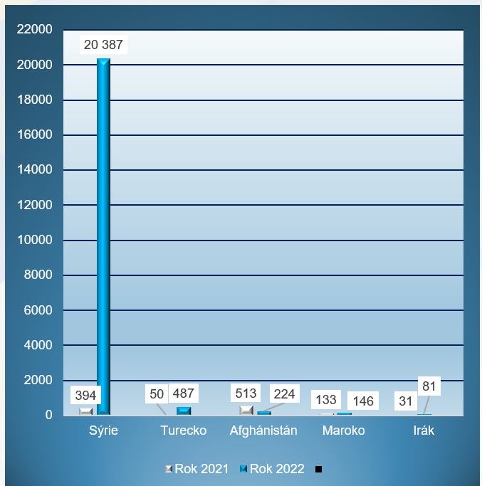 На незаконной транзитной миграции в 2022 году попались 21852 человека человек. Это на 20552 больше (+1643%) в межгодовом сравнении. Среди транзитных нелегалов преобладали граждане Сирии, Турции, Афганистана и Марокко, направлявшиеся через Чехию в Германию.
