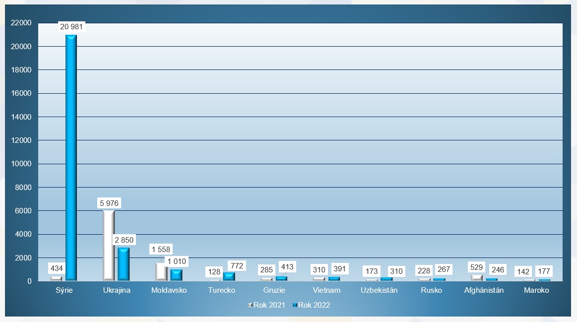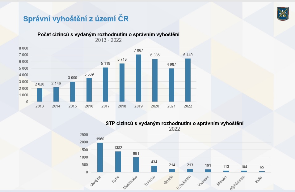 Всего в 2022 году из Чехии было выдворено 6449 нелегалов (+1462 в межгодовом сравнении). Чаще всего речь шла о гражданах Украины (1960 человек), Сирии (1382) и Молдовы (991).