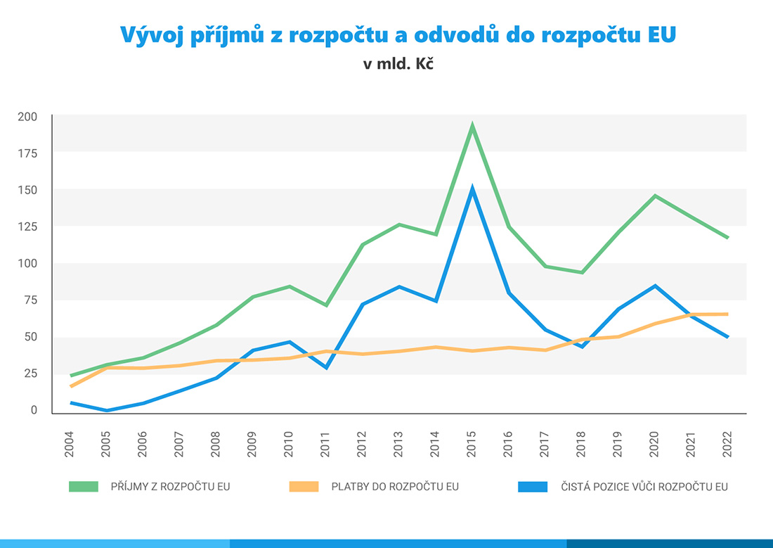 За весь 2022 год Чехия получила из бюджета Евросоюза 117,4 млрд крон, а отправила в него 66,5 млрд крон. Кроме того, страна получила 10,3 млрд крон в рамках программы NextGeneration (NGEU) по восстановлению европейской экономики после коронакризиса. Таким образом, в общей сложности республика получила выгоду в 61,2 млрд крон. Об этом в среду сообщил чешский Минфин.