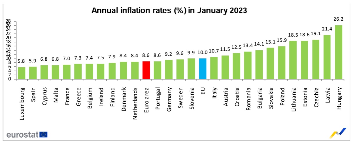 Самая высокая инфляция в январе была зафиксирована в Венгрии (26,2%), самая низкая – в Люксембурге (5,8%).