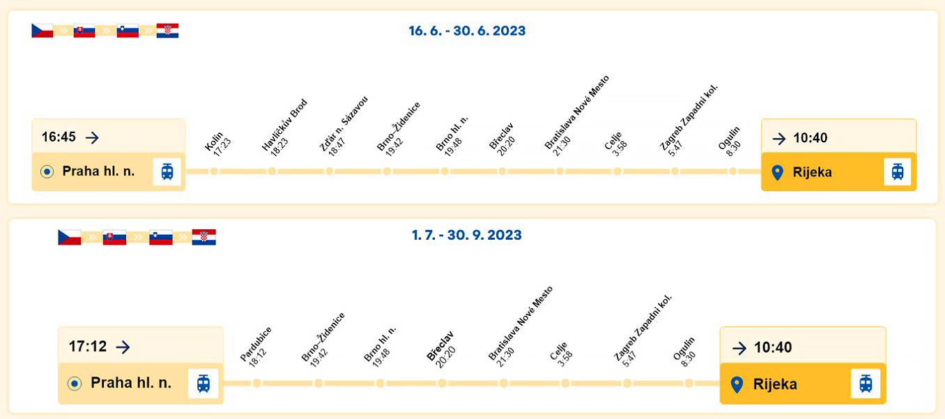 Маршрут поезда проляжет через Брно и Братиславу в хорватские города Загреб, Огулин и Риека. Там можно будет пересесть на автобусы до других курортов страны, в том числе до Сплита.