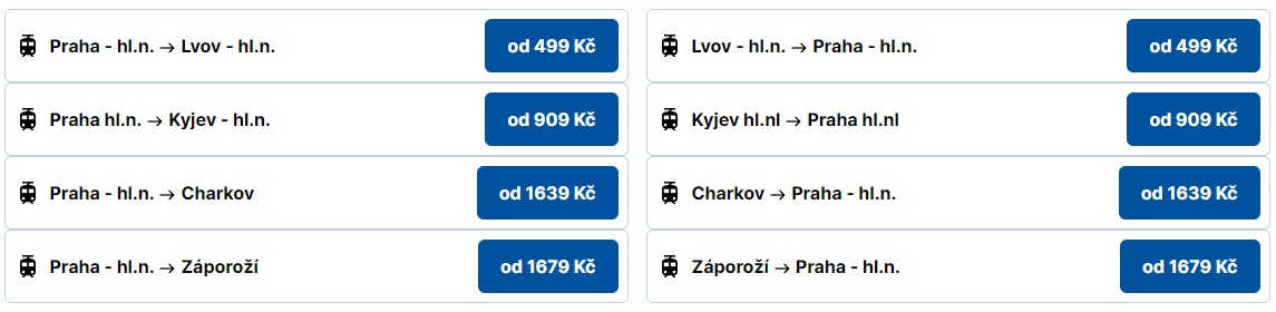 Стоимость билетов из Праги в Харьков (в одну сторону) начинается от 1639 крон за сидячее место, и от 2139 крон за спальное место. Билеты в Харьков стоят от 1679 / 2179 крон.