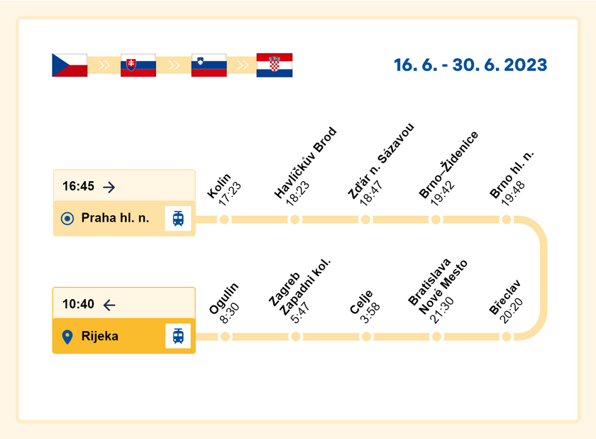 Маршрут поезда пролегает через Брно и Братиславу в хорватские города Загреб, Огулин и Риека. Там можно пересесть на автобусы до других курортов страны, в том числе до Сплита.