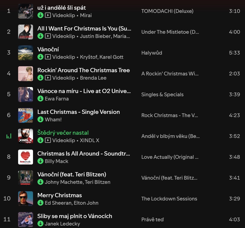 Студия Universal Music представила в сервисе Spotify специальный плейлист для Чехии к рождественским праздникам 2025 года. Он составлен как из всемирно известных, так и чешских праздничных хитов.