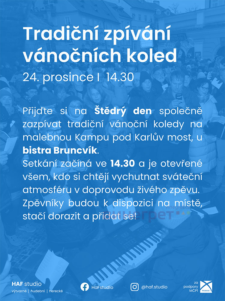 Жители и гости Праги могут еще сильнее погрузится в атмосферу традиционного чешского Рождества. В среду, 24 декабря, в 14:30 на острове Кампа прямо под Карловым мостом состоится массовое пение рождественских колядок.