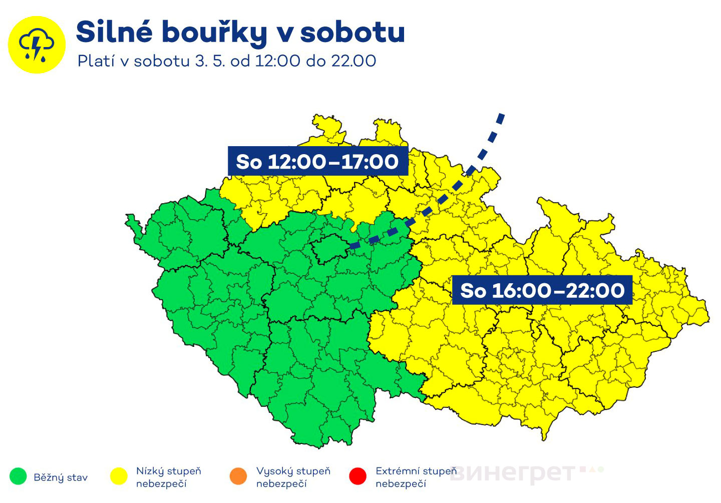 Чешский гидрометеорологический институт объявил на субботу, 3 мая, предупреждение о сильных грозах. Оно действует с 12:00 до 22:00 и распространяется на большую часть страны, кроме Праги, Пльзеньского, Южночешского и Карловарского края.