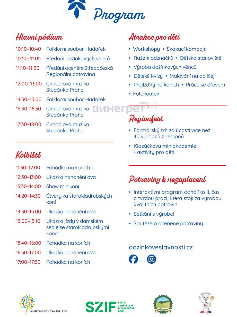 Гости смогут попробовать десятки сезонных блюд и продуктов от чешских фермеров, увидеть выступления фольклорных коллективов, посмотреть презентации нескольких сельскохозяйственных ассоциаций, выставку сельскохозяйственных животных и техники.