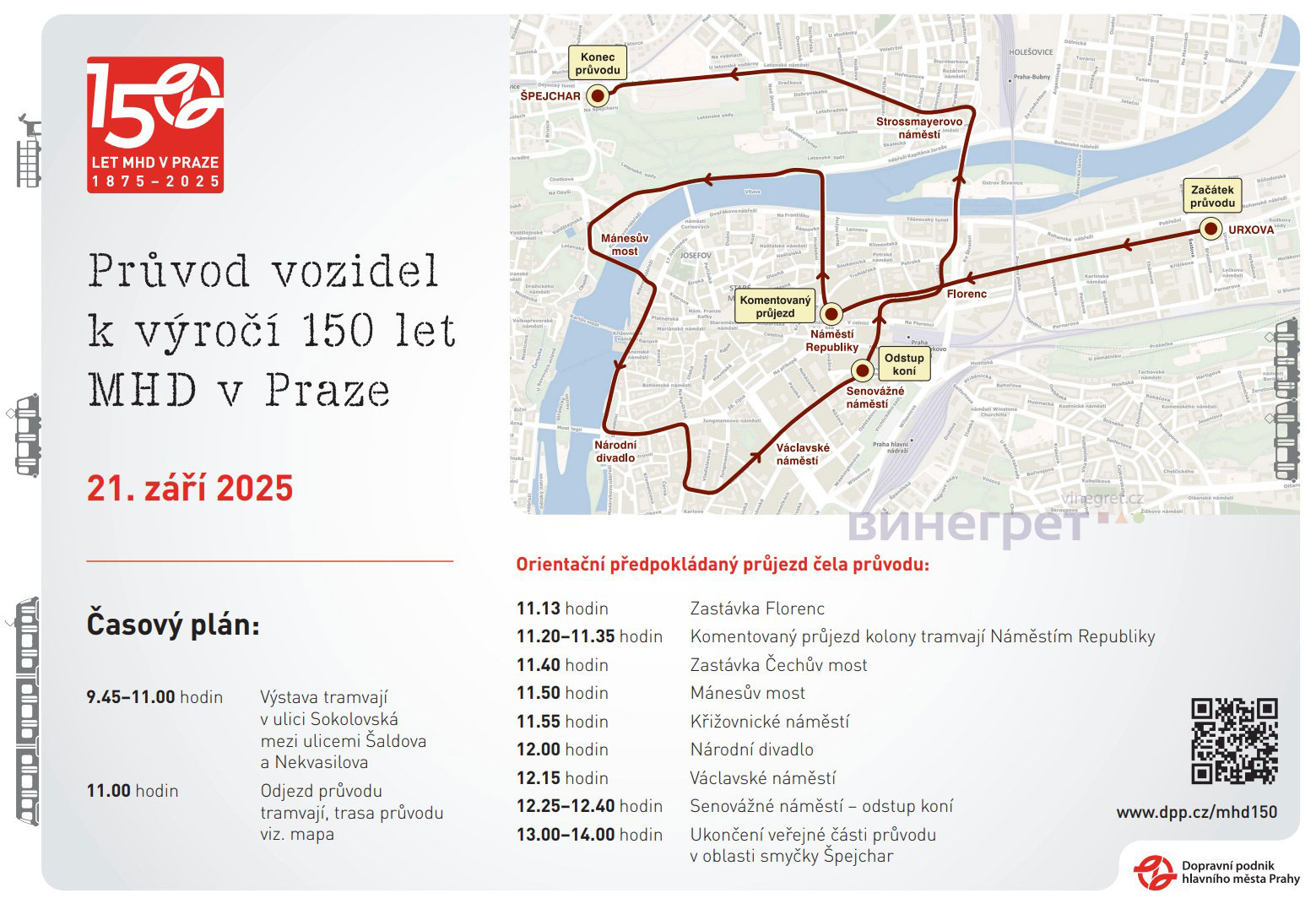 - 13:00–14:00 ukončení průvodu ve smyčce Špejchar, možnost fotografování tramvají před jejich návratem do vozoven