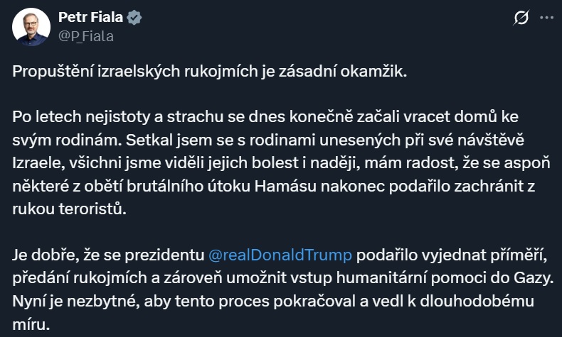 Хорошо, что благодаря президенту Трампу удалось договориться о перемирии, передаче заложников и одновременно обеспечить ввоз гуманитарной помощи в сектор Газа. Теперь необходимо, чтобы этот процесс продолжался и привел к долгосрочному миру», – заявил глава чешского правительства Петр Фиала.