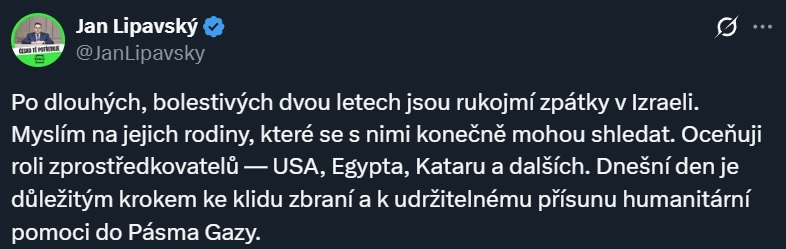 «После долгих, мучительных двух лет заложники вернулись в Израиль. Я думаю об их семьях, которые наконец могут с ними воссоединиться. Я высоко оцениваю роль посредников — США, Египта, Катара и других стран. Сегодняшний день является важным шагом к прекращению огня и устойчивой поставке гуманитарной помощи в сектор Газа», – написал в соцсети X министр иностранных дел республики Ян Липавский.