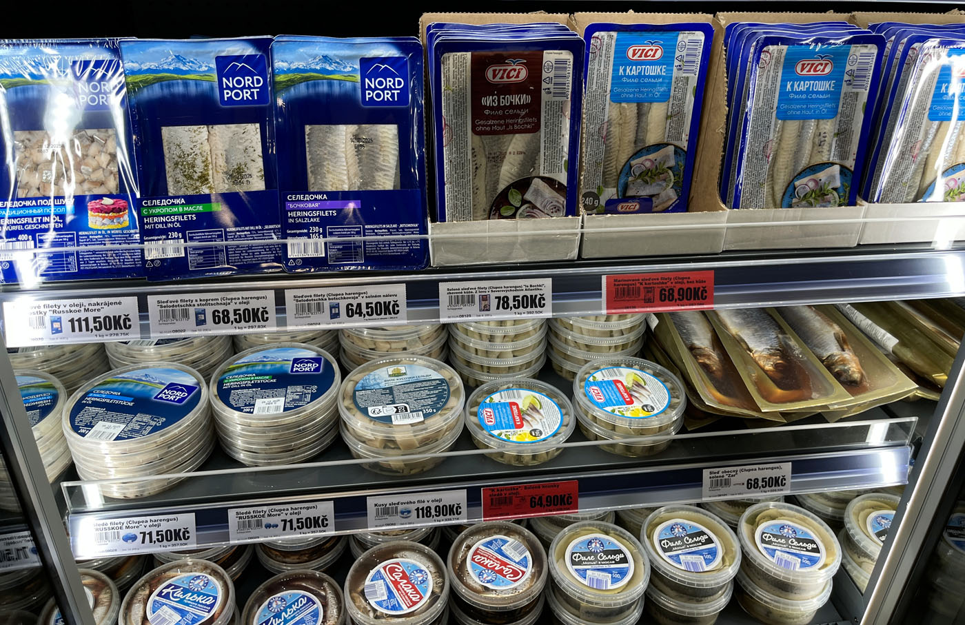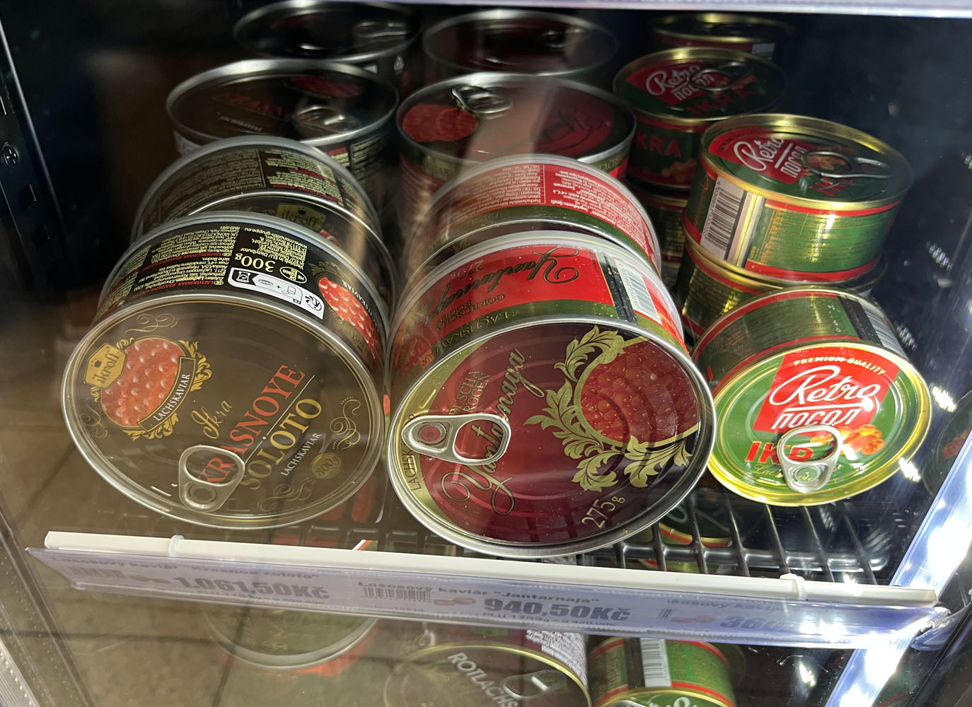 В магазине есть несколько видов красной и черной икры, любимые шпроты, килька в томатном соусе, печень трески, горбуша и другие рыбные консервы.