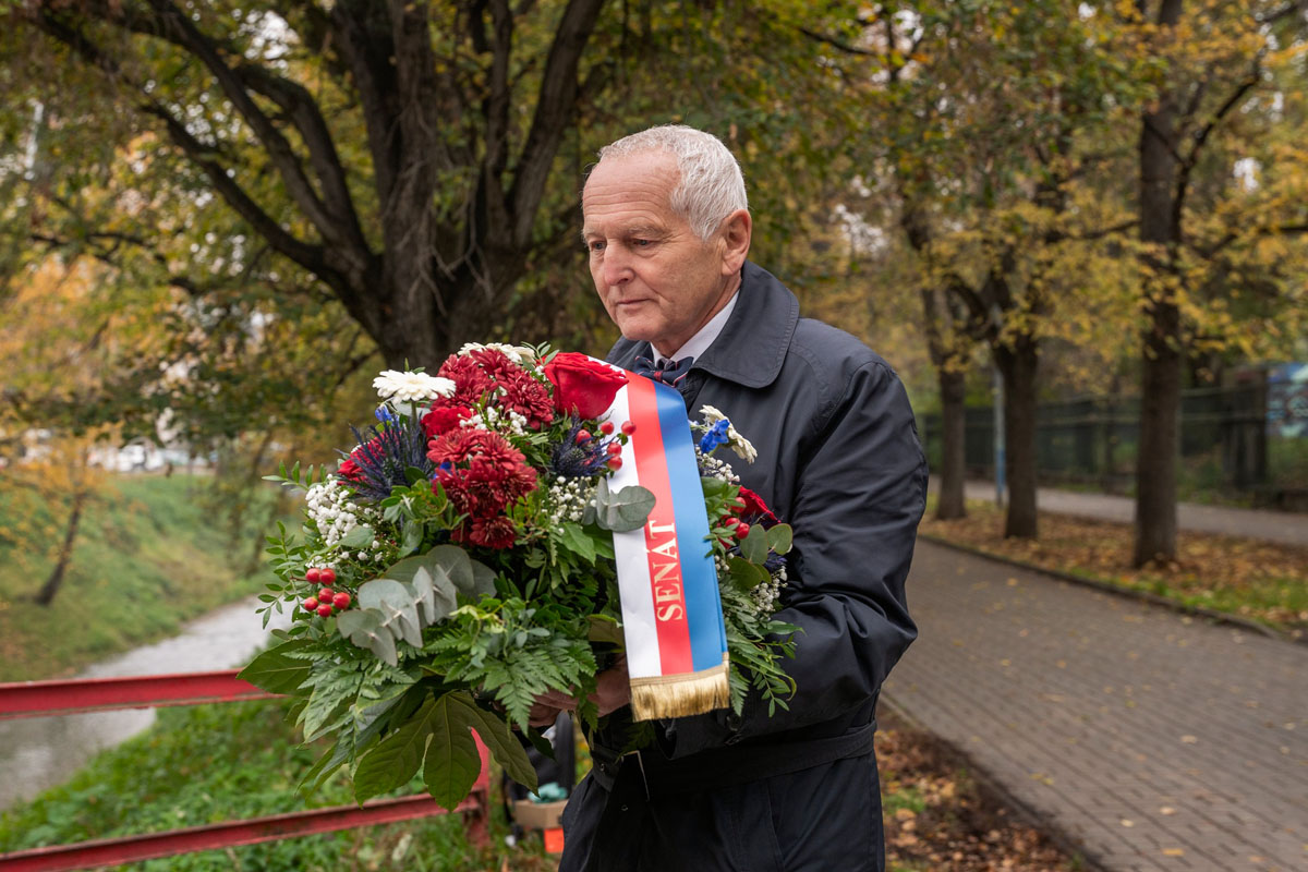 Участники организованной посольством Украины памятной акции принесли цветы на пешеходный мост имени Василия Макуха в районе Вршовице, который примыкает к улице Ukrajinská.