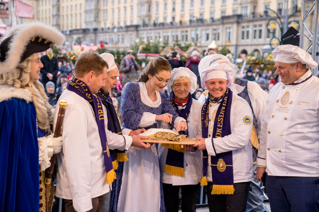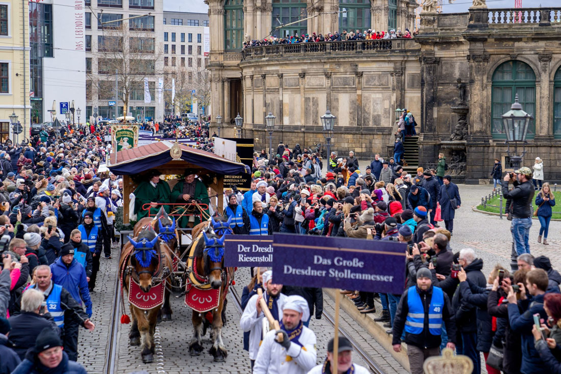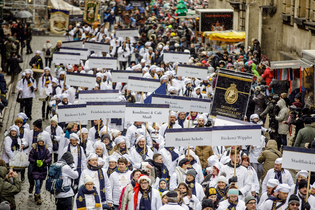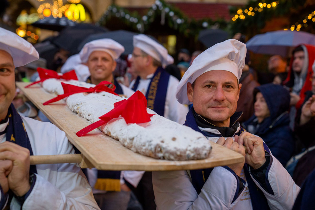 По улицам города будут проходить костюмированные процессии, гигантский штоллен повезут на специальной тележке, будет много музыки, танцев, акробатических выступлений и прочих проявлений радости, которые закончатся торжественным разрезанием штоллена.