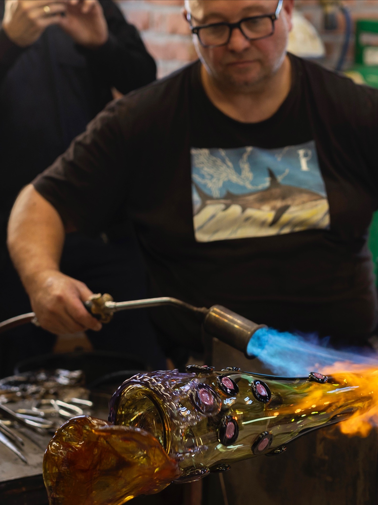 «Выставка соединяет два художественных мира в уникальном симбиозе – стеклянные инсталляции Йиржи Пачинки, переливающиеся в лучах подсветки, и музыку Петра Шпатины.