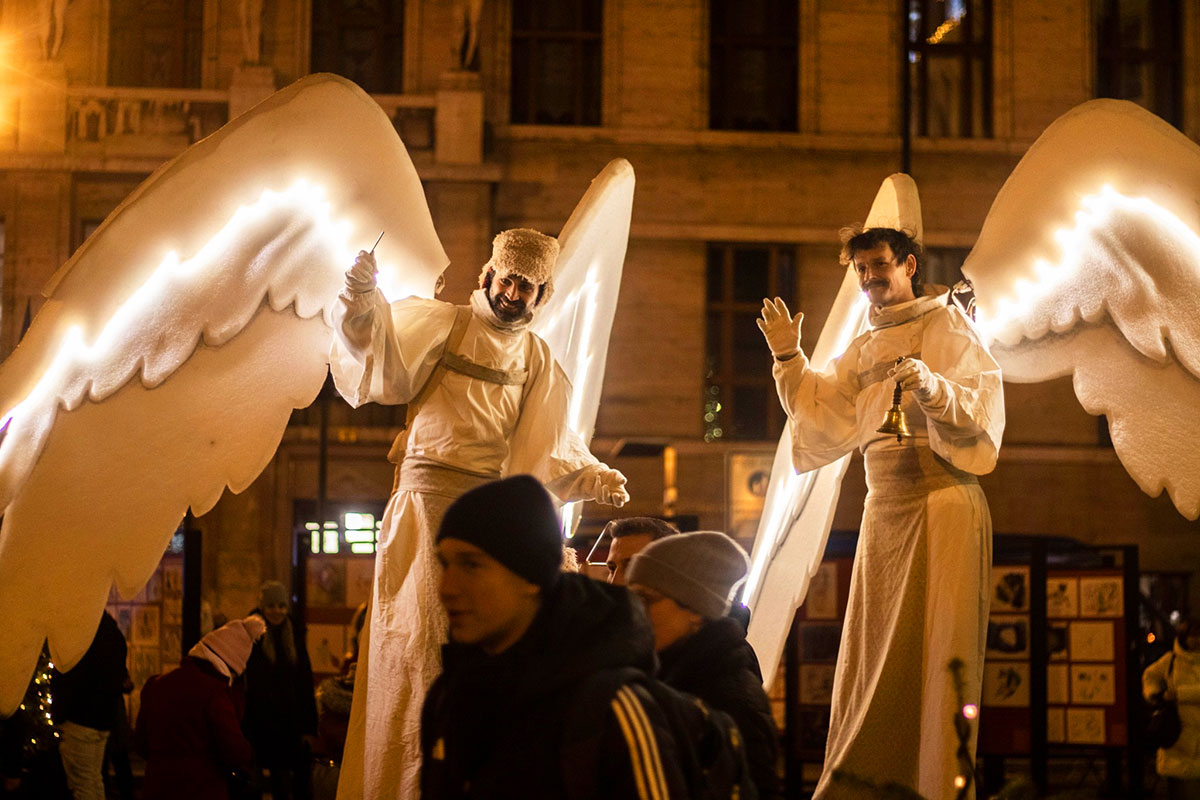Артисты на ходулях и в белоснежных нарядах с крыльями за спиной поучаствовали в церемонии зажжения елки на Марианской площади, где сегодня открылась рождественская ярмарка.