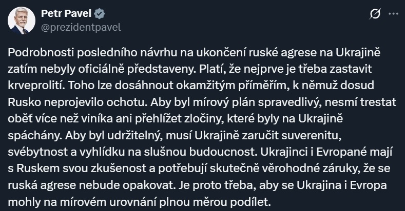 У украинцев и европейцев есть свой опыт с Россией, и им нужны действительно надежные гарантии того, что российская агрессия не повторится. Поэтому необходимо, чтобы Украина и Европа могли в полной мере участвовать в мирном урегулировании», – написал президент Чехии в соцсети X.