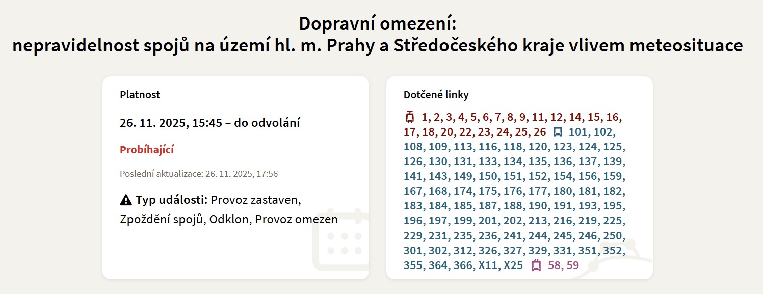 Вечером в среду, 26 ноября, в Праге случился новый коллапс общественного транспорта. Он произошел из-за снегопада и технической неисправности одного из трамваев, который заблокировал сразу несколько маршрутов, проходящих через вокзал Масарика.