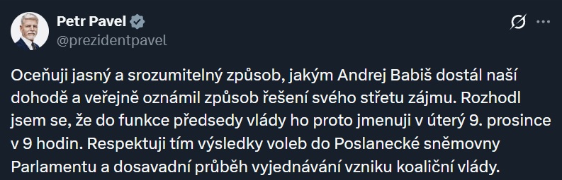 «Я ценю ясный и понятный способ, которым Андрей Бабиш выполнил наше соглашение и публично объявил о способе решения своего конфликта интересов. Поэтому я решил назначить его на должность премьер-министра во вторник, 9 декабря, в 09:00. Этим я уважаю результаты выборов в палату депутатов парламента и ход переговоров о формировании коалиционного правительства», — написал Павел в соцсети X.