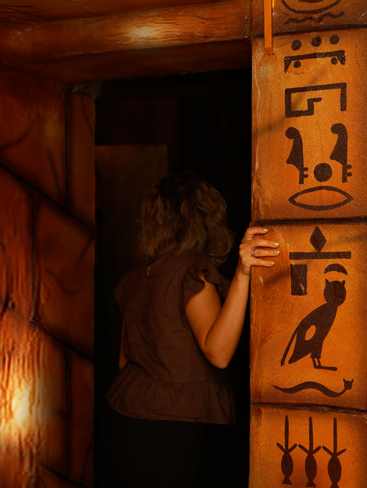 После небольшого инструктажа попадаем в саму гробницу, где нас встречает весьма антуражный интерьер: стены украшены иероглифами, таинственные артефакты подсвечивают факелы, а вокруг ощущается атмосфера египетского подземелья. Сразу вспоминаются любимые фильмы «Мумия» и «Индиана Джонс».